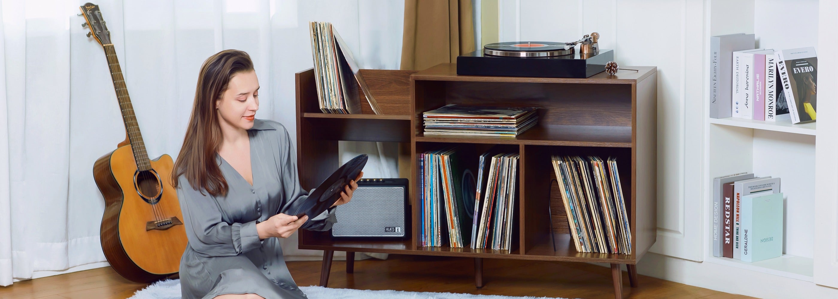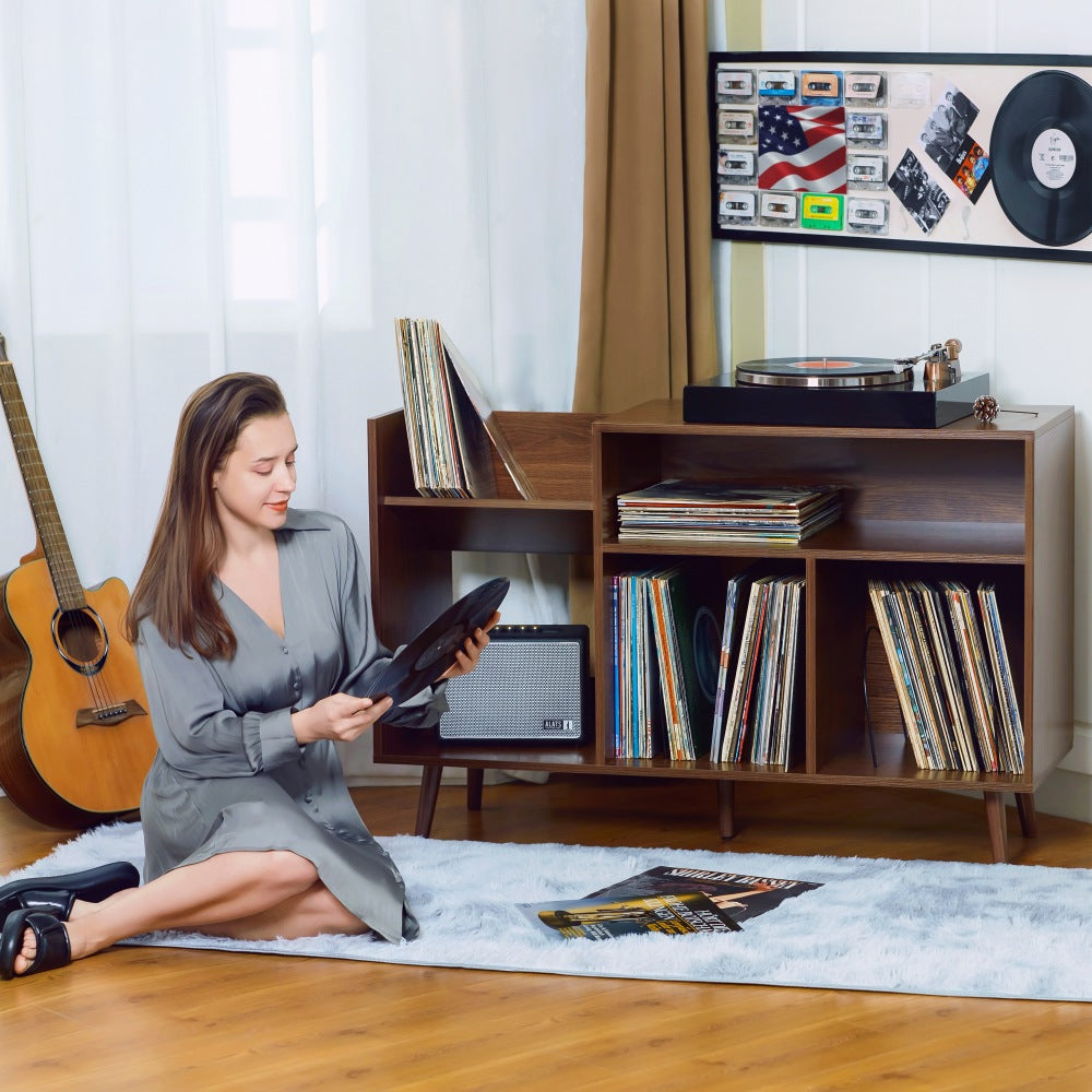This vinyl record storage cabinet holder uses a rustic brown natural wood grain design with solid wood decorative legs. It retains the retro wood texture, but without losing the modern pop style.