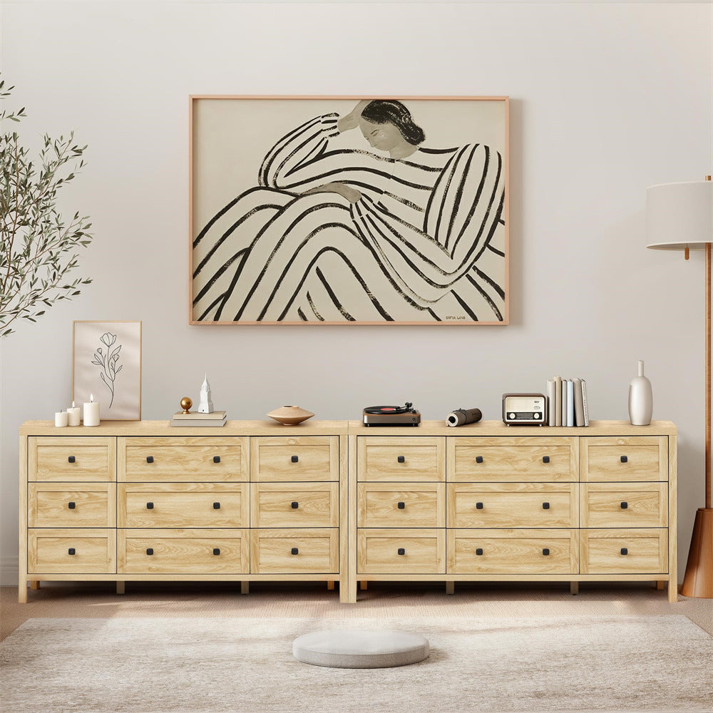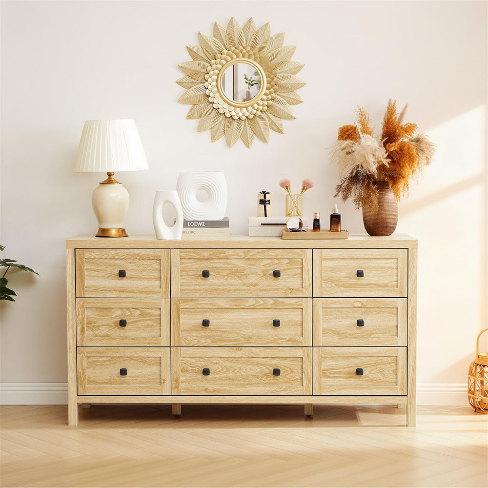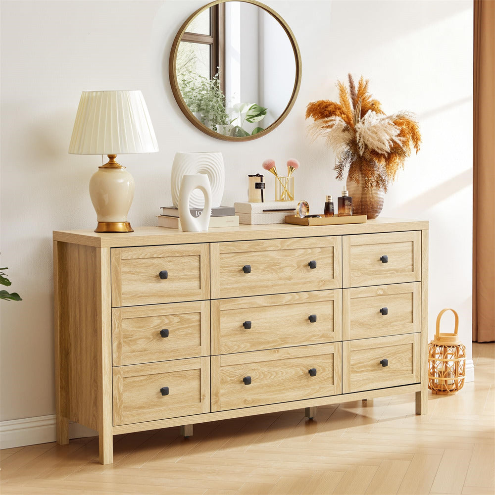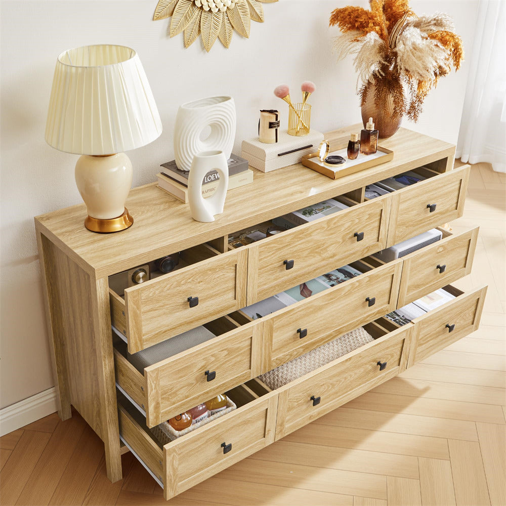 Product Advantage: The bedroom dresser is designed with Splicing drawers design. The wood dresser desktop space is spacious, equipped with 9 drawers, providing ample storage space for your daily storage. The golden metal handle blends seamlessly with the Wood dresser. Solid wood legs ensure higher durability and are equipped with anti tipping devices for safer and more reliable use.