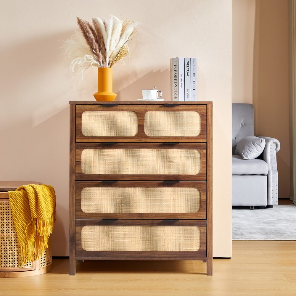 Modern Rattan Dresser Table Chest of Drawers with Metal Handles and 4 Drawers