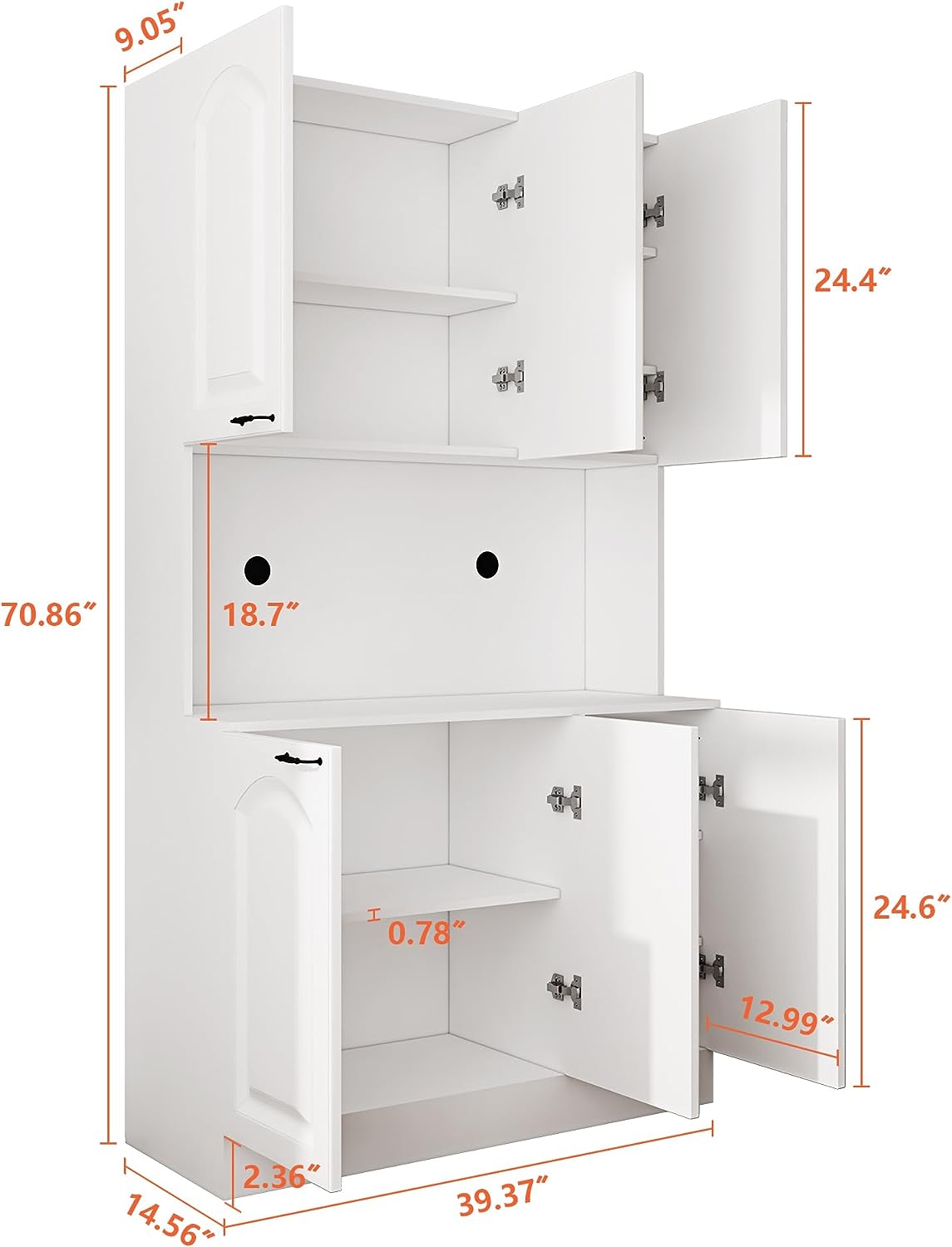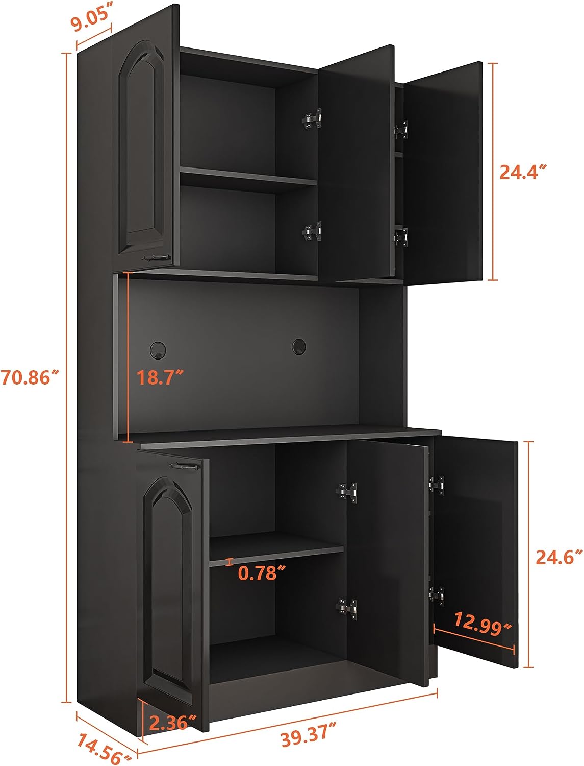 - 【Multipurpose】 This microwave stand with storage is perfect for kitchen use, but can also be used in pantries, closets, garages, or in the bathroom for additional storage space. The kitchen cabinet is easy to assemble with the included step-by-step instructions and hardware that is carefully labeled and packaged. Overall Dimension: 39.37”W x 14.56” D x70.86”H.