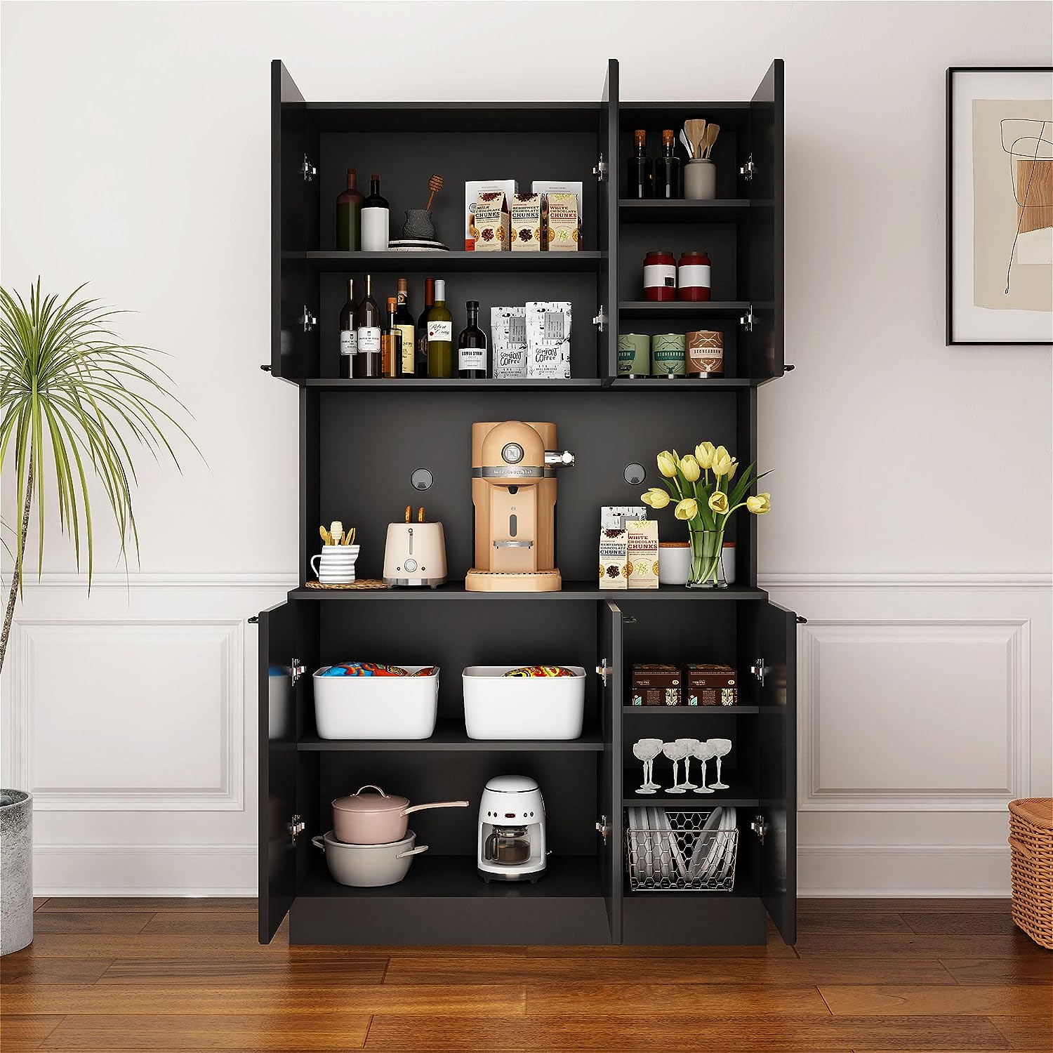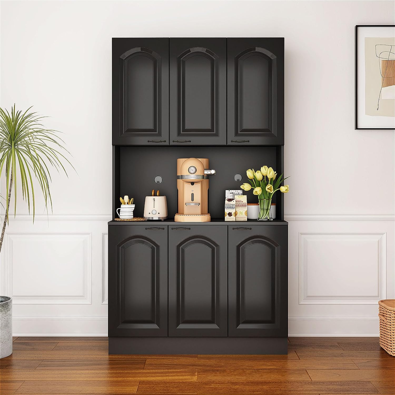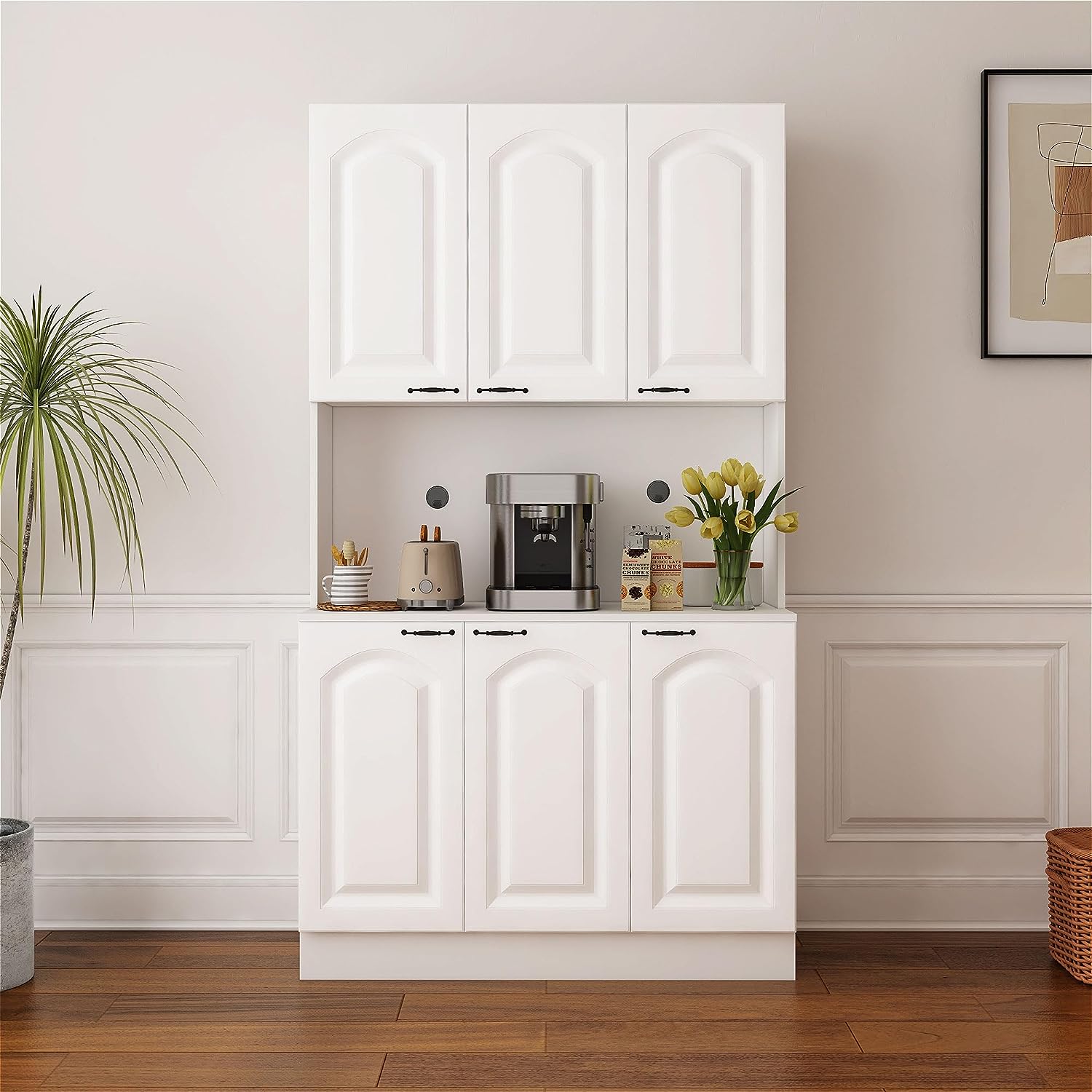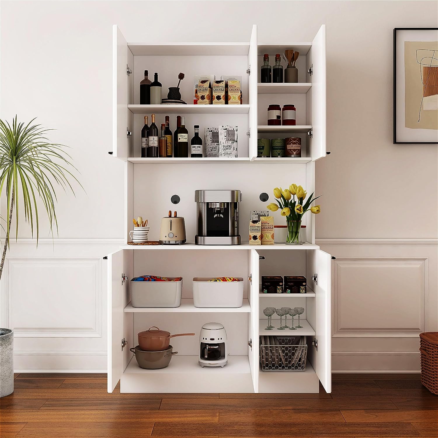 - 【Modern Design】 Sleek surfaces and metal handles create a chic modern free-standing pantry cabinet that will easily fit in with your kitchen. Storage Cabinet creates a smooth surface that is easy to clean with a damp cloth and helps keep your kitchen buffet hutch secure and sanitary.