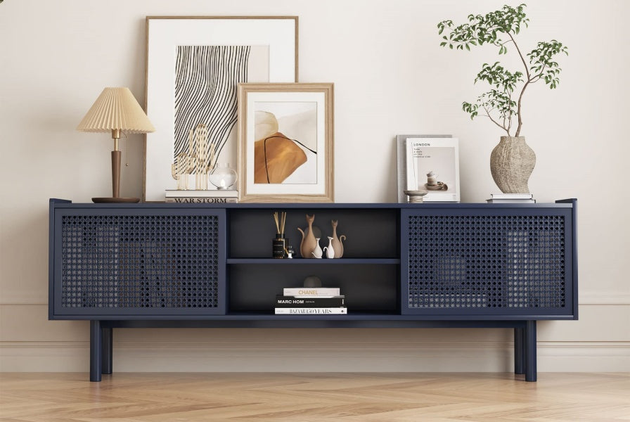 Sale Quick View Boho Wooden Console Table TV Stand Up to 65 Inch with Curved Iron Rattan Doors and Drawer$279.00$229.00 /NaturalBlackBlue -
