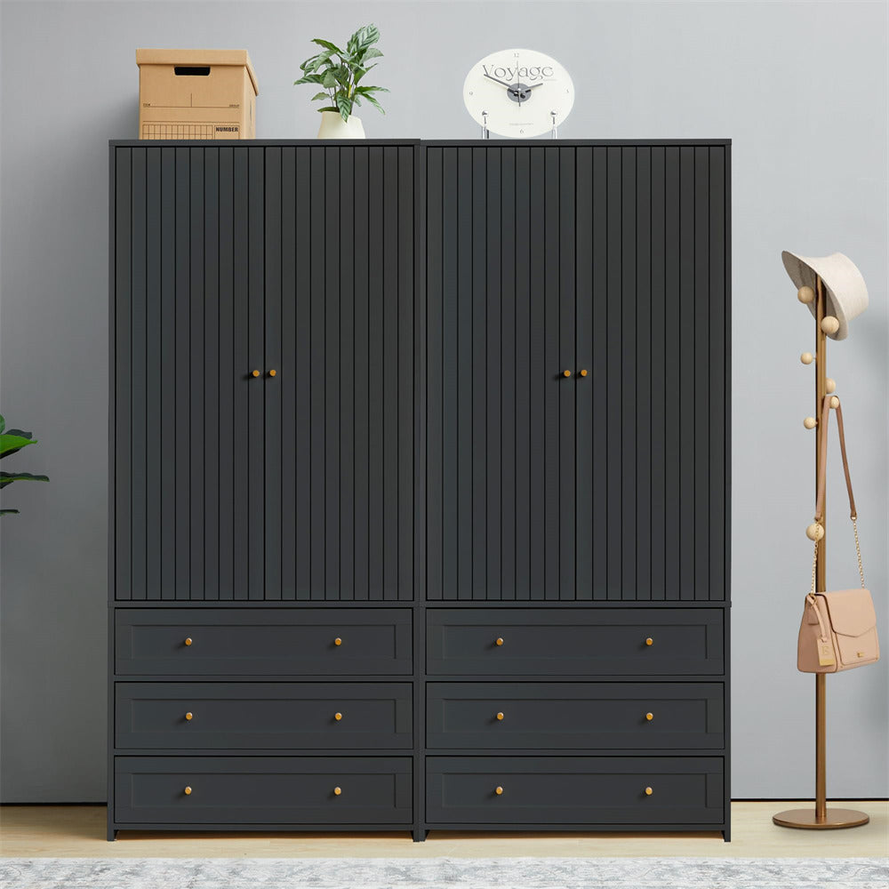 FREESTANDING STYLE: The freestanding design allows you to place this wardrobe closet wherever it best suits your needs, it consist of elegent wood cabinet top, exquisite gold handle and minimalist wood base, cleverly matched with grain veneer, which brings a perfect visual effect.