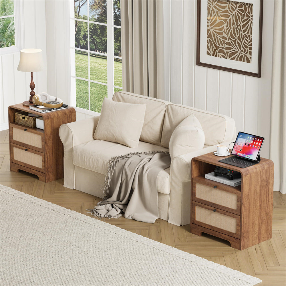 Modern Curved Nightstand Wooden Side Table with Charging Station and 2 Drawers