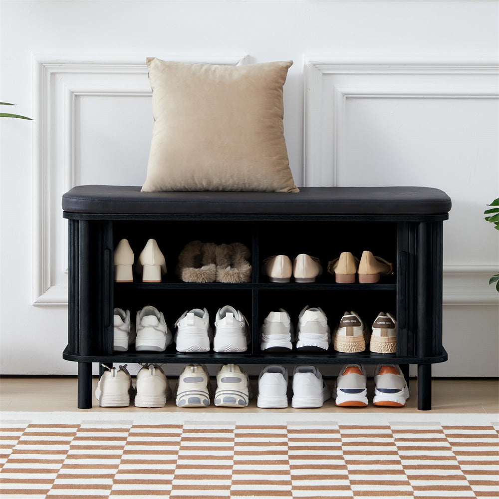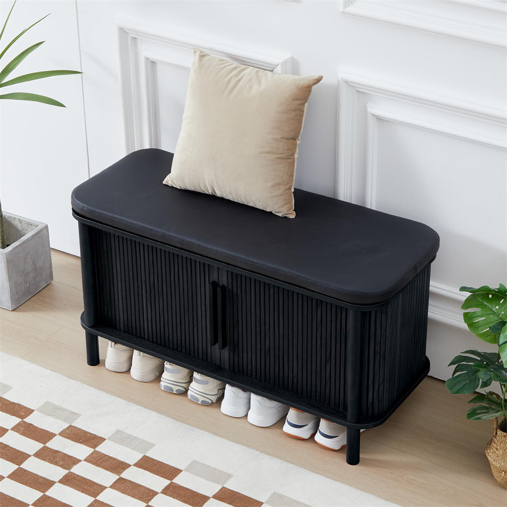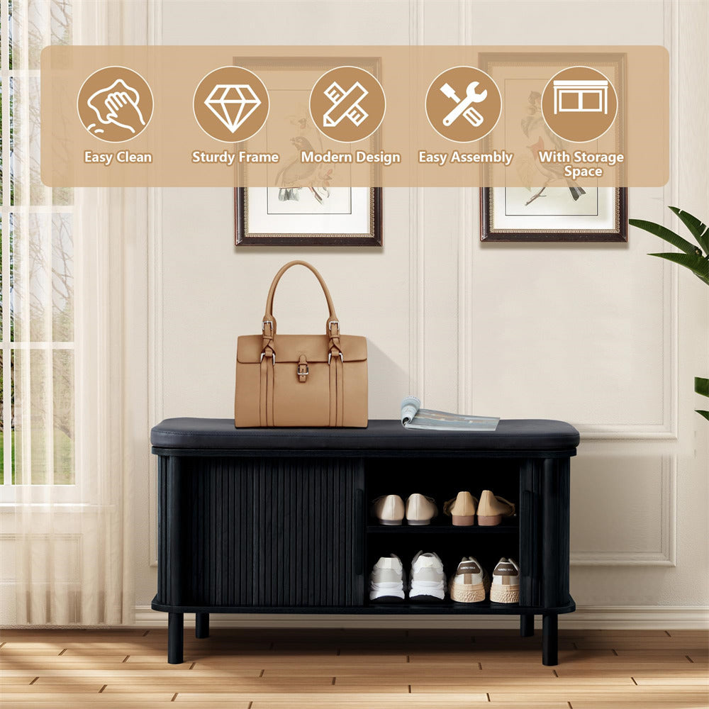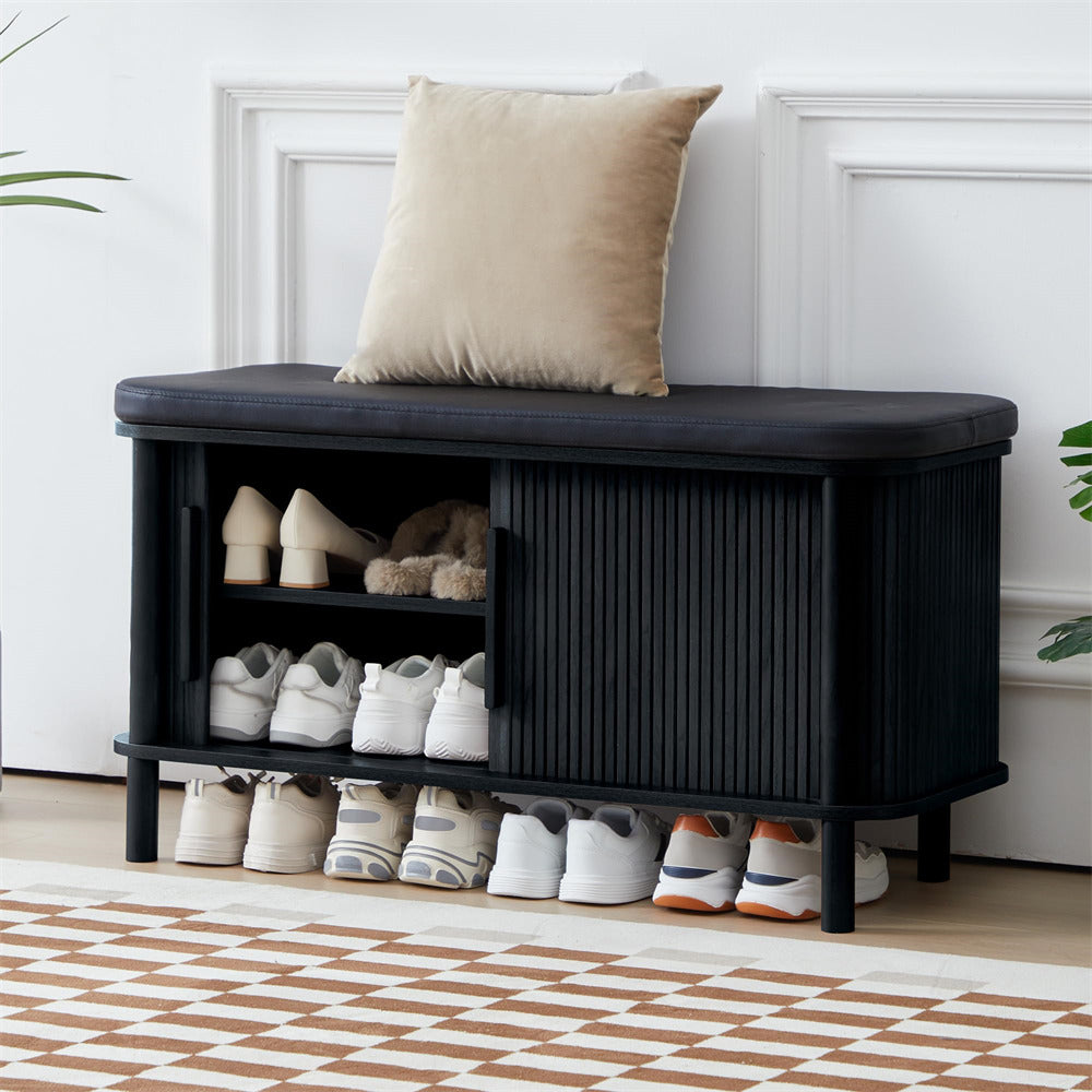 Modern Shoe Storage Bench with Leather Cushion and Sliding Door