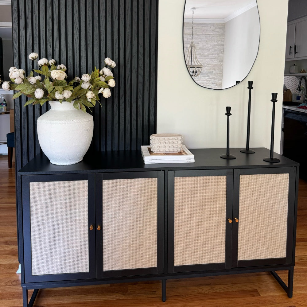 This piece made a perfect addition to my dining room. I had been searching for a black cabinet with rattan and this one is exactly what I was looking for. The rattan is not as yellow/brassy as a lot of other options out there, which I love. Fairly easy to assemble independently, but does take a little time. The copper colored knobs on the front also add a nice touch.